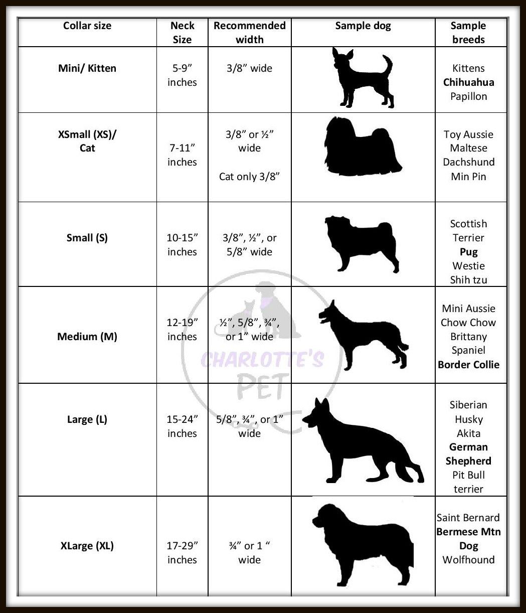 Kitten fits necks 5 to 9 inches and 3/8 inches wide with breakaway buckle